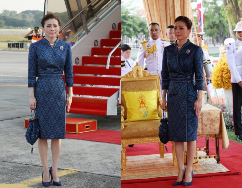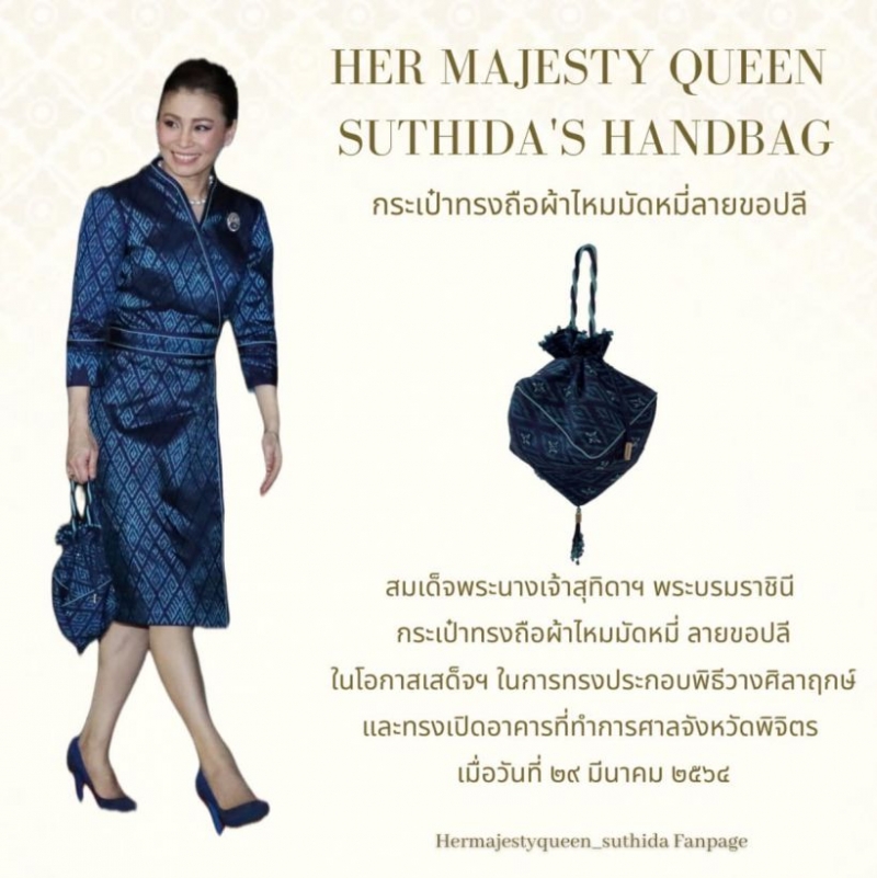 สมเด็จพระนางเจ้าสุทิดา พัชรสุธาพิมลลักษณ พระบรมราชินี ทรงฉลองพระองค์ผ้าไหมมัดหมี่ ลายขอปลี พร้อมกระเป๋าทรงถือผ้าไหมมัดหมี่ลายขอปลี