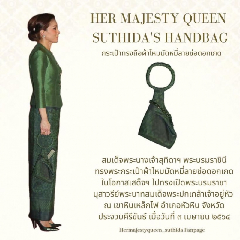 พระราชินี ทรงฉลองพระองค์-ถือกระเป๋าผ้าไหมมัดหมี่ลายช่อดอกเกด