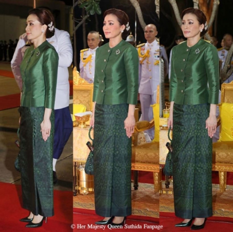 สมเด็จพระนางเจ้าสุทิดา พัชรสุธาพิมลลักษณ พระบรมราชินี ฉลองพระองค์ชุดไทยเรือนต้นผ้าไหมพื้นเรียบสีเขียวต้นเกด