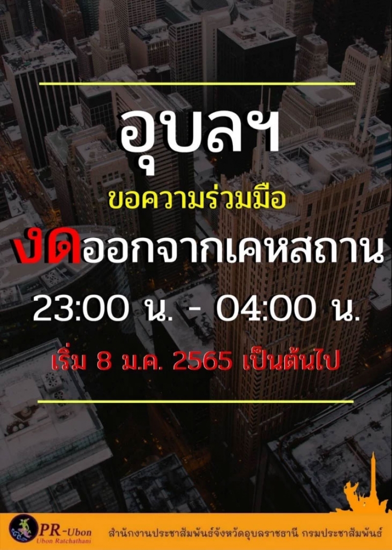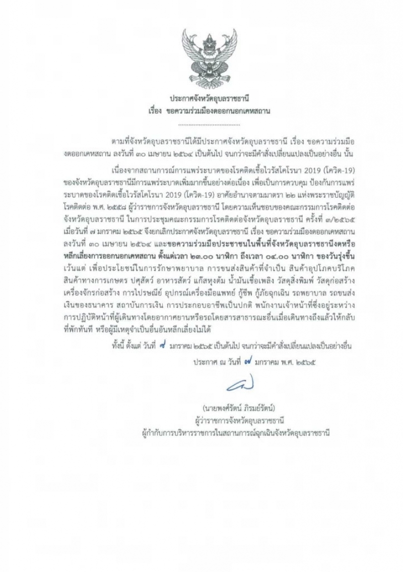 ประกาศ ณ วันที่ ๗ มกราคม พ.ศ. ๒๕๖๕ (นายพงศ์รัตน์ ภิรมย์รัตน์) ผู้ว่าราชการจังหวัดอุบลราชธานี ผู้กำกับการบริหารราชการในสถานการณ์ฉุกเฉินจังหวัดอุบลราชธานี
