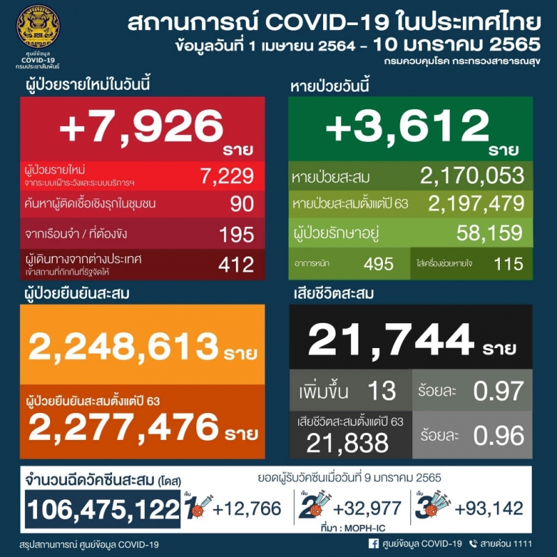 วันจันทร์ที่ 10 มกราคม 2565 เวลา 12.30 น. สถานการณ์การติดcvในประเทศ
