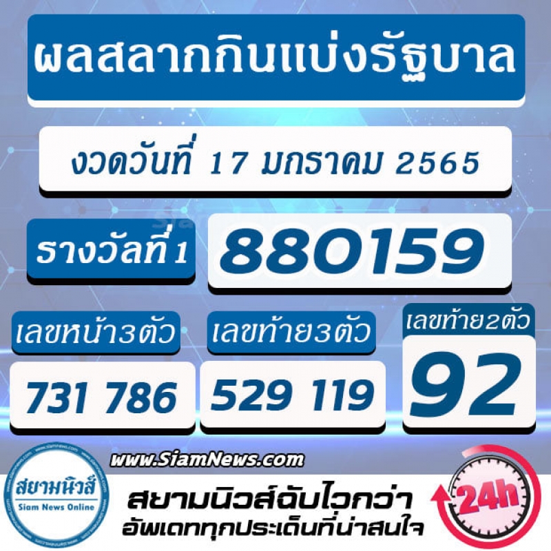 ผลสลากกินแบ่งรัฐบาล ประจำวันที่ 17 มกราคม 2565