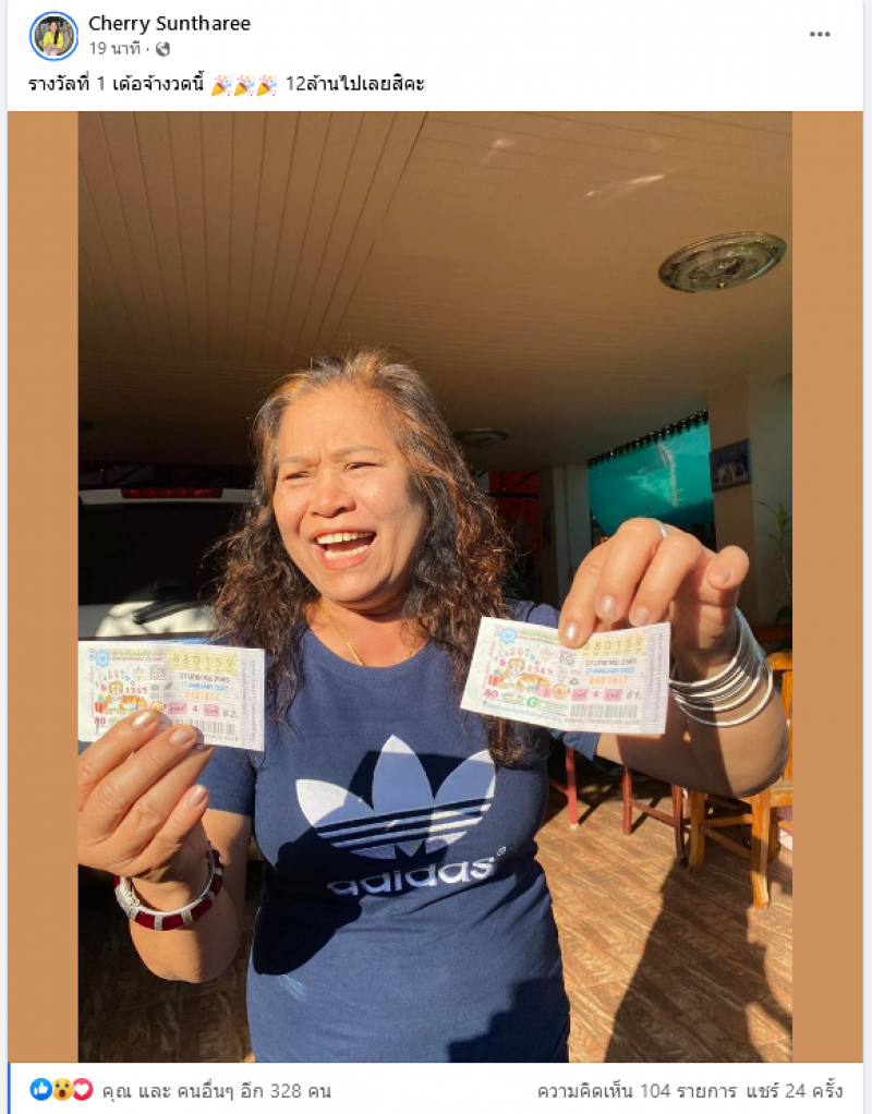 ล่าสุดพบคนถูกรางวัลที่ 1 โดยเฟสบุ๊ค Cherry Suntharee ได้ออกมาโพสต์ภาพพร้อมระบุข้อความว่า รางวัลที่ 1 เด้อจ้า12ล้านไปเลยสิคะ