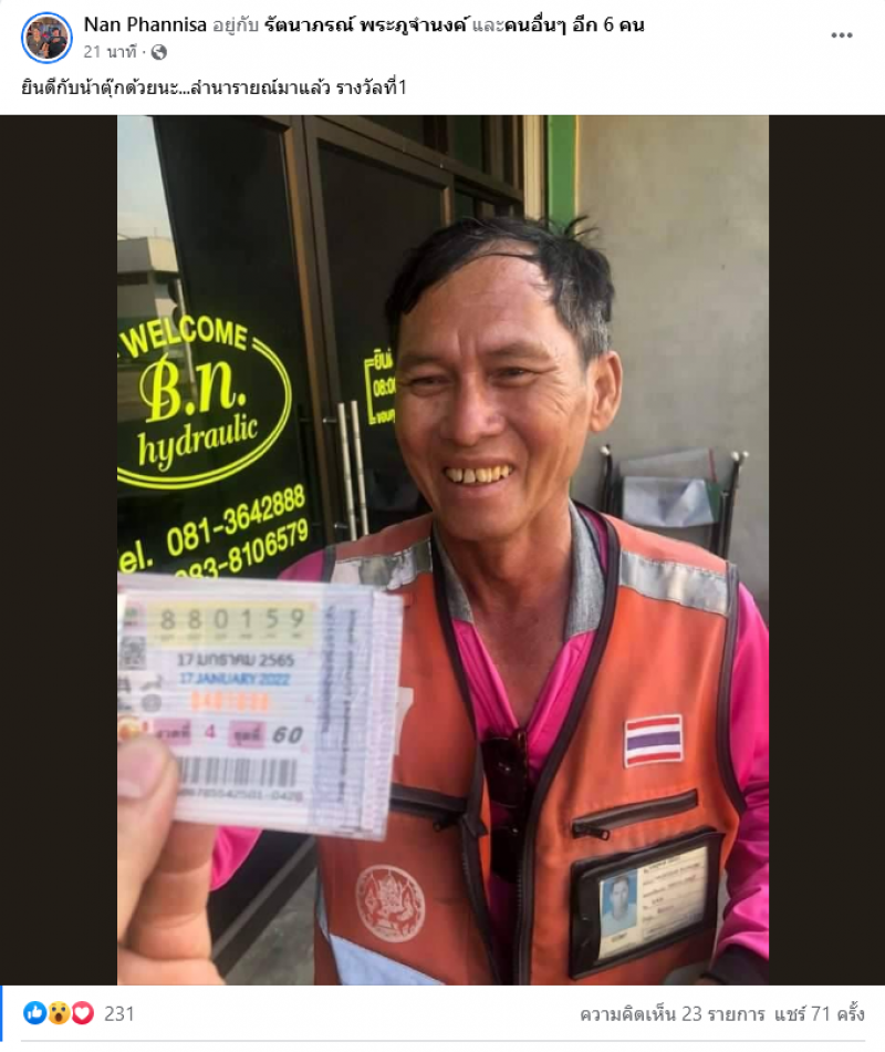 ล่าสุดพบคนถูกรางวัลที่ 1 โดยเฟสบุ๊ค Nan Phannisa ได้ออกมาโพสต์ภาพพร้อมระบุข้อความว่า ยินดีกับน้าตุ๊กด้วยนะ ลำนารายณ์มาแล้ว รางวัลที่1