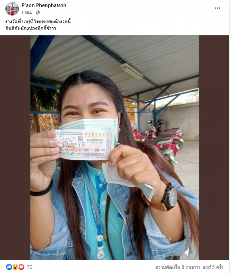 ล่าสุดพบคนถูกรางวัลที่ 1 โดยเฟสบุ๊ค P'aon Phenphatson ได้ออกมาดพสต์ภาพ พร้อมระบุข้อความว่า
