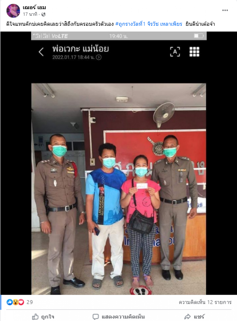 ล่าสุดพบคนถูกรางวัลที่ 1 โดยได้ออกมาดพสต์ภาพพร้อมระบุข้อความว่า ดีใจแทนคักบ่เคยคิดเลยว่าสิถึงกับครอบครัวตัวเอง ถูกรางวัลที่1 จิรวัช เหลาเพียร ยินดีนำเด้อจ้า