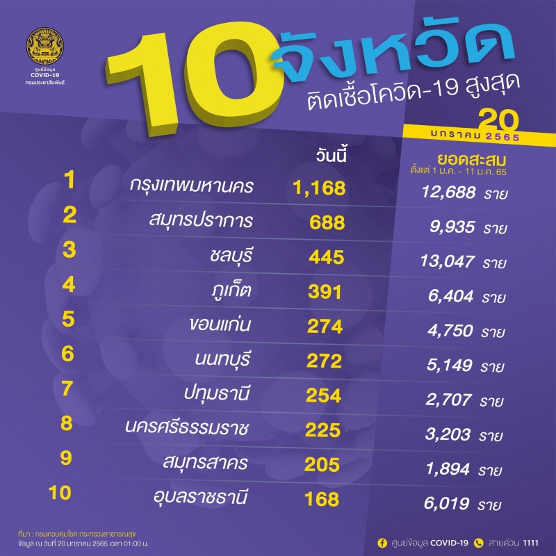 ศบค. เผย 10 อันดับจังหวัดที่มีผู้ติดcvรายใหม่ในประเทศไทยรายใหม่สูงสุด วันที่ 20 ม.ค.65
