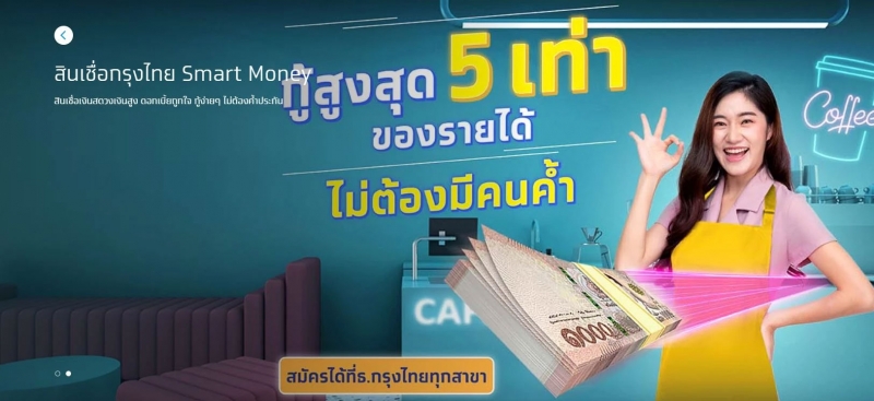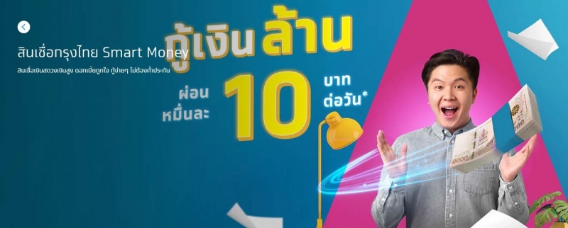ธนาคารกรุงไทย ปล่อยสินเชื่อกรุงไทย Smart Money สินเชื่อเงินสด วงเงินสูง ดอกเบี้ยถูกใจกู้ง่ายๆไม่ต้องค้ำประกัน สินเชื่อกรุงไทย Smart Moneyให้ยืมเงิน 100,000 บาท กู้เงินล้าน ผ่อนหมื่นละ10บาทต่อวัน มีรายละเอียดดังนี้เเละช่องทางการสมัครดังนี้