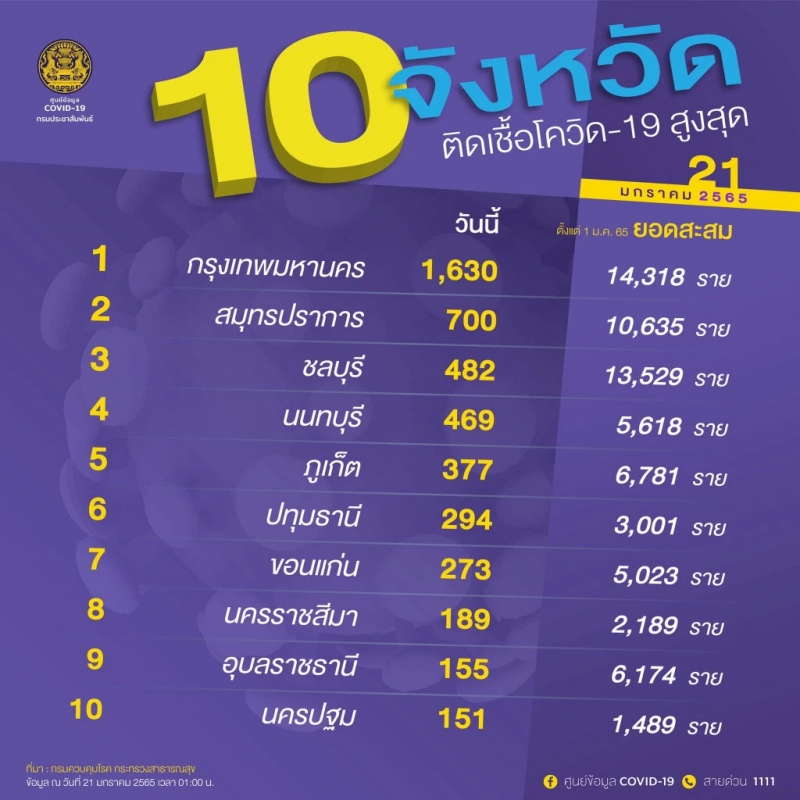 ผู้ติดcvในประเทศรายใหม่ วันที่ 21 มกราคม 2565 ตรวจสอบ 10 จังหวัดอันดับ