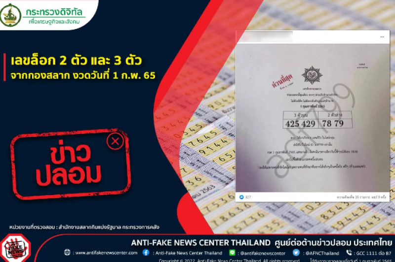 ทางศูนย์ต่อต้านข่าวปลอม Anti-Fake News Center Thailand ได้ตรวจสอบข้อเท็จจริงกับทาง สํานักงานสลากกินแบ่งรัฐบาล กระทรวงการคลัง พบว่าข้อมูลดังกล่าวนั้น เป็นข้อมูลเท็จ