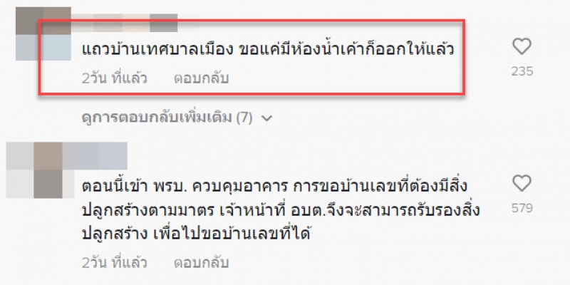 เรียกได้ว่าเป็นอีกหนึ่งเรื่องราวที่โลกออนไลน์เข้ามาแสดงความเห็น และวิพากษ์วิจารณ์กันเป็นจำนวนมาก หลัง สมาชิก Tiktok รายหนึ่งได้ออกมาโพสต์คลิปบ้านที่ตัวเองสร้างด้วยน้ำพักน้ำแรงที่มีอยู่พอได้พักอาศัย เสร็จแล้วก็อยากจะมีบ้านเลขที่ จึงได้เตรียมเอกสารถ่ายรูปตามขั้นตอน แต่สุดท้ายเจ้าหน้าที่กลับปฏิเสธไม่ยอมออกบ้านเลขที่ให้ โดยให้เหตุผลว่าบ้านหลังเล็กเกินไปให้ต่อเติมออกมาอีกให้ได้รวมกัน 5 เมตร ทำหลายคนต่างเข้ามาวิพากษ์วิจารณ์จำนวนมาก