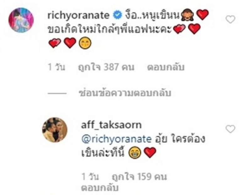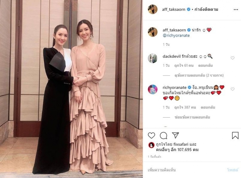 ขณะที่สาวริชชี่ก็โพสต์ภาพคู่แอฟ เช่นกัน พร้อมติดแฮชแท็กชื่อละคร #ขอเกิดใหม่ใกล้ๆเธอ ซึ่ง แอฟ ก็เข้ามาคอมเมนต์ด้วยว่า สวยหวานนนน