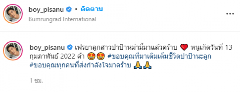 เพราะว่า ล่าสุดหนุ่มบอยได้โพสต์ภาพโมเมนต์สุดพิเศษ ผ่านทางอินสตาแกรมของเจ้าตัว @boy_pisanu เพื่อแนะนำสมาชิกใหม่ของบ้านนิ่มสกุล ที่เพิ่งจะลืมตาดูโลกไปเมื่อวันที่ 13 กุมภาพันธ์ 2565 ที่ผ่านมา