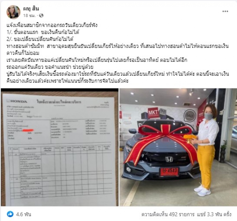 สาววอนช่วย ออกรถวันเดียว เกียร์พัง ศูนย์ไม่รับผิดชอบ