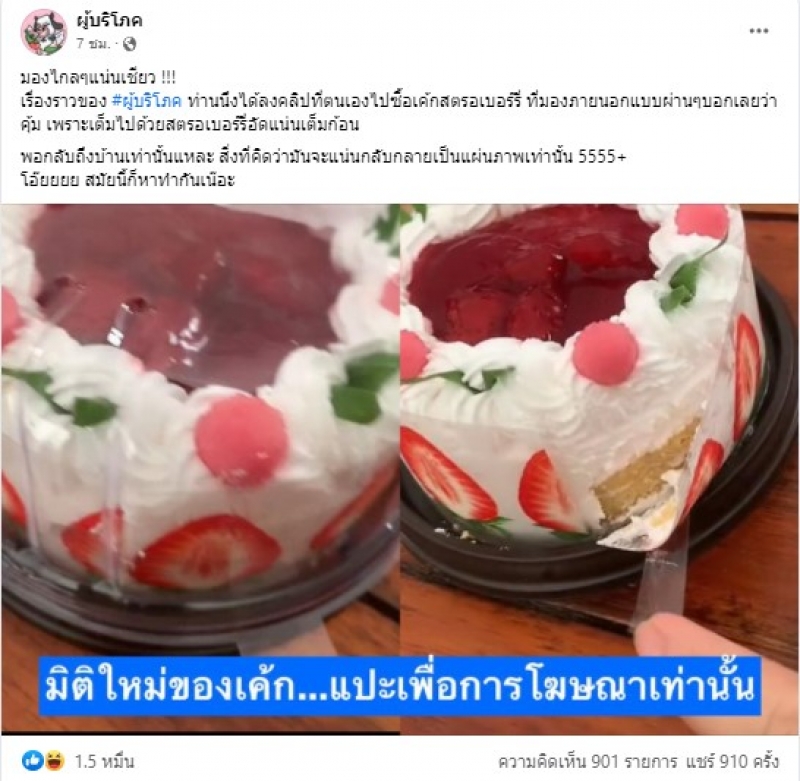 มองไกลๆแน่นเชียว เรื่องราวของ ผู้บริโภค ท่านนึงได้ลงคลิปที่ตนเองไปซื้อเค้กสตรอเบอร์รี่ ที่มองภายนอกแบบผ่านๆบอกเลยว่าคุ้ม เพราะเต็มไปด้วยสตรอเบอร์รี่อัดแน่นเต็มก้อน