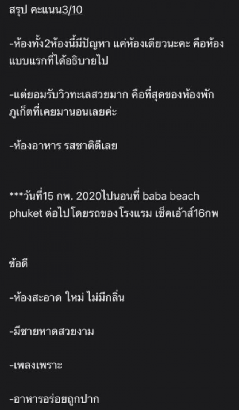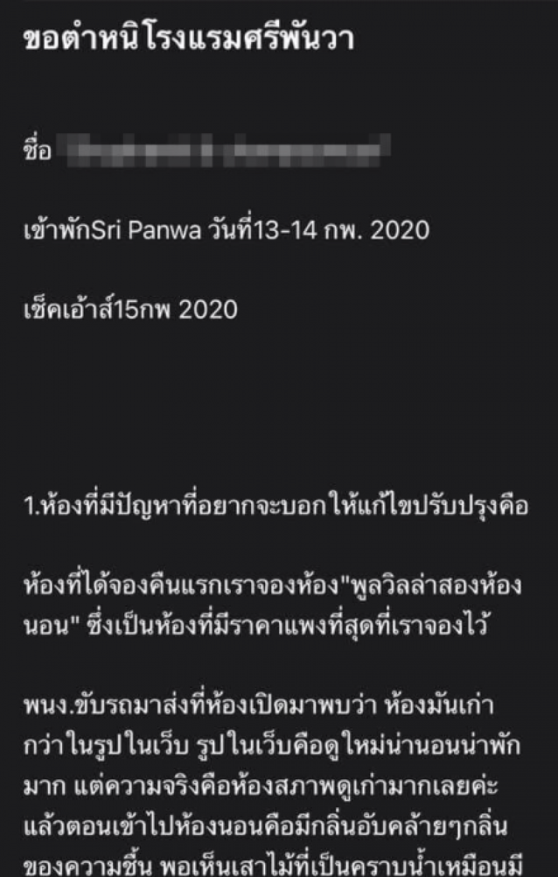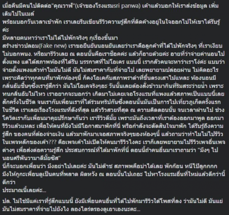 เราอยากจะบอกว่า เกิดมาไม่เคยเจอโรงแรมที่แพงแล้วสภาพเป็นแบบนี้เลยสักครั้ง จนเรากับเพื่อนเราที่ได้ร่วมทริปกันซึ่งตอนนั้นมันเป็นการไปเที่ยวภูเก็ตครั้งแรกของเราเลย เรื่องโรงแรมที่ดังที่สุด แล้ววิวสวยที่สุด ณ ความคิดตอนนั้น จนเวลาผ่านไป ช่วงที่ผ่านมาเรากับเพื่อนมาคุยปรึกษากันว่า เรารีวิวดีมั้ย เพราะมันถึงเวลาที่เราต้องออกมาพูด ออกมารีวิวแล้วแหละ เพื่อให้คนที่ยังไม่มีโอกาสมาพักที่นี่ หรือกำลังจะมาพัก ได้รับรู้ถึงความรู้สึก ของคนที่ต้องจ่ายเงิน แล้วมาพักมาเจอสภาพจริง ๆ ของห้อง ๆ นี้ แล้วถามว่าทำไมไม่ไปรีวิว ในเพจหลักของเค้า คือเพจเค้าไม่เปิดให้คนมารีวิวไงคะ เราก็เลยพยายามไปรีวิวเพจอื่นเพจต่าง ๆ เพื่อส่งต่อความรู้สึก ประสบการณ์ที่ได้มาพักที่นี่ ตอนนี้ถ้าคนอื่นมาเราถามว่า เธอ ๆ ไปนอนศรีพันวามาดีมั้ยซิส