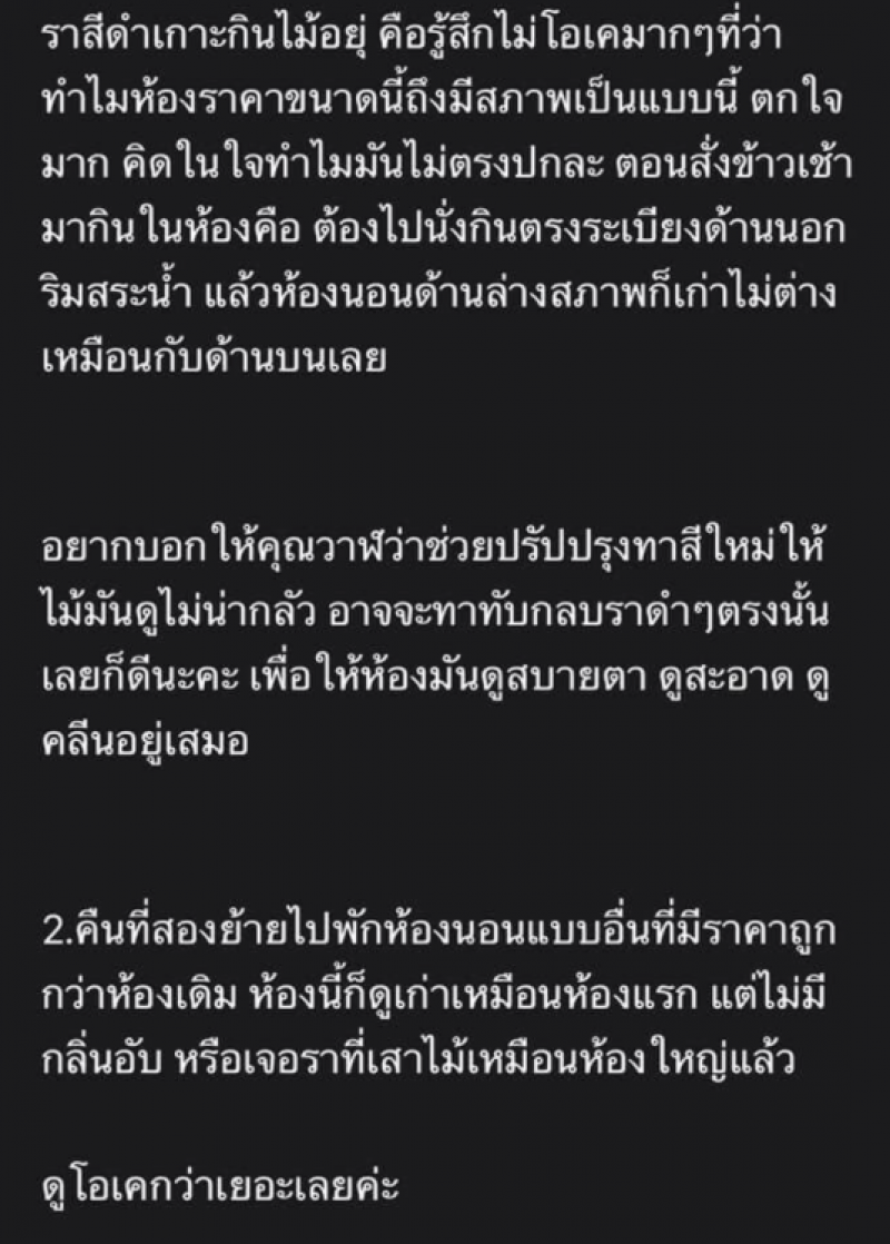 สร้างข่าวปลอม เราขอยืนยันเลยว่าเราคือลูกค้าที่ได้ไปพักจริง ๆ ที่เราเงียบ ไม่บอกพนง. หรือมารีวิวเลย ณ ตอนนั้นคือเรารู้สึกอายด้วยค่ะ อายที่ว่าจ่ายค่านอนไปตั้งแพง แต่ได้สภาพห้องที่ได้รับ บรรยากาศที่ไม่โอเค แบบนี้ แบบว่าจ่ายตั้งแพงแล้วทำไมมันไม่ดี มันไม่สมราคากับที่จ่ายไป เลยพยายามปล่อยผ่าน ไม่คิดอะไร เพราะคิดว่าทุกคนที่มาพักห้อง ๆ นี้ ก็คงโอเคกับสภาพราดำที่ขึ้นตรงเสาไม้แหละ ห้องนอนมีกลิ่นอับชื้น ๆ ซึ่งเรารู้สึกว่า มันไม่โอเคจริง ๆ อะ วันนั้นเลยต้องสั่งข้าวมากินที่ริมสระว่ายน้ำ เพราะทนกลิ่นอับไม่ไหว