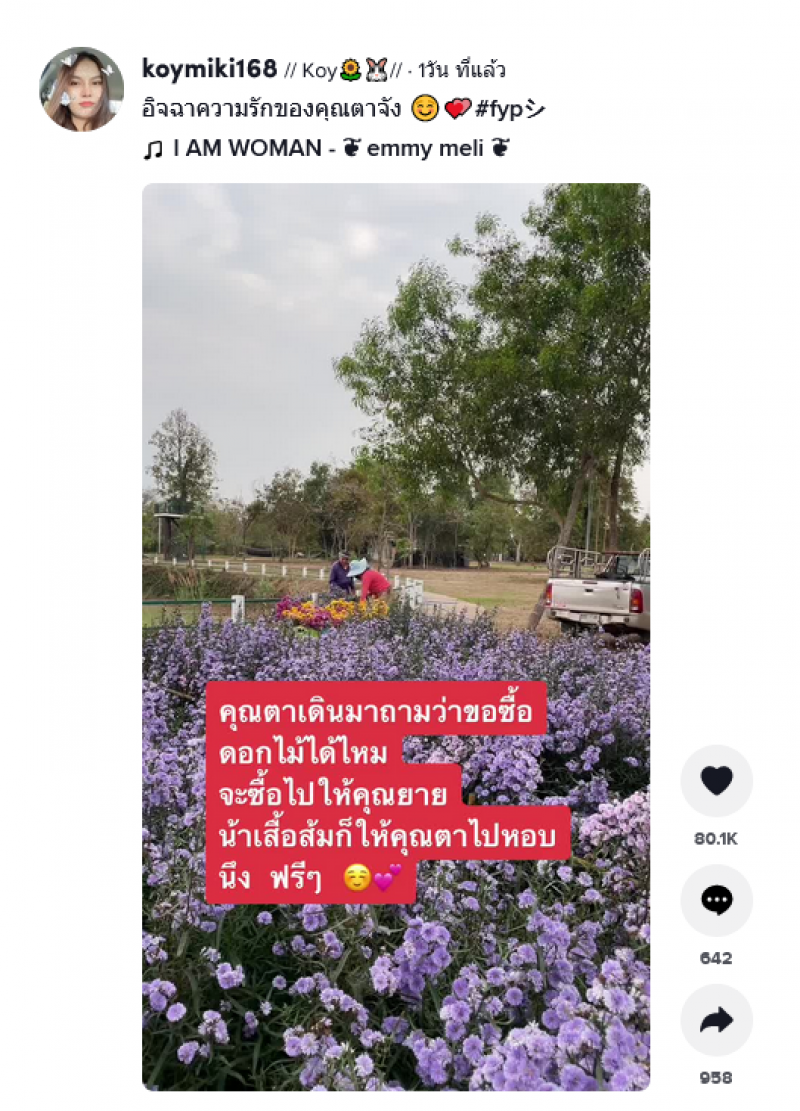 โดยในคลิปคุณตาท่านนี้มาขอซื้อดอกไม้ที่สวน เพื่อที่จะเอาไปให้คุณยาย ทางด้านคนสวนจึงได้ตัดดอกไม้ให้กับคุณตาไปฟรีๆ เป็นภาพที่เห็นแล้วน่าประทับใจมากๆ