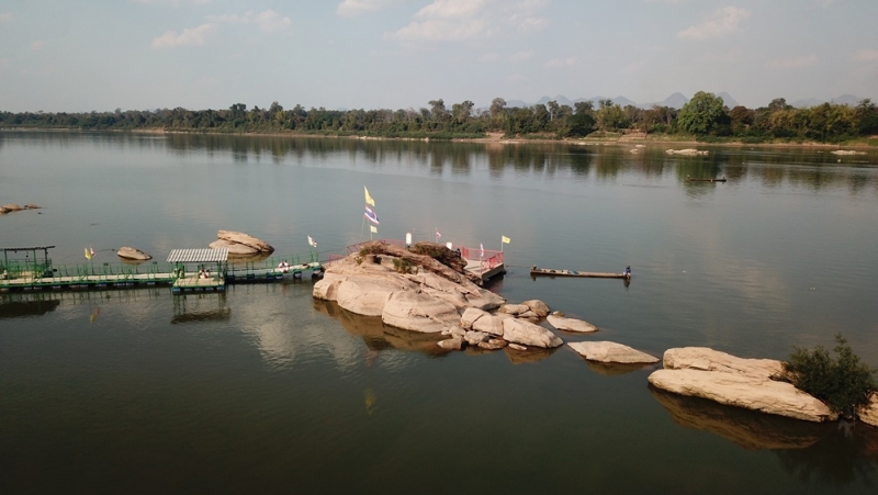 ถือเป็นอีกจุดสำคัญที่พบเห็นความเปลี่ยนแปลงของระดับน้ำโขงลดลงอย่างรวดเร็ว จนทำให้พบเห็นโขดหิน โผล่ขึ้นเหนือน้ำชัดเจนหลายจุด รวมถึง สถานที่ศักดิ์สิทธิ์ใต้น้ำโขง คือ รอยพระพุทธบาทศักดิ์สิทธิ์กลางน้ำโขง อายุราว 2,500 ปี ที่จารึกบนโขดหินกลางน้ำโขง