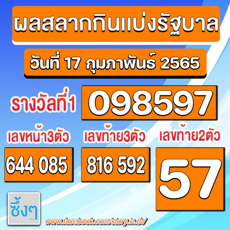 ผ่านไปแล้ว สำหรับการประกาศผลสลากกินแบ่งรัฐบาล ประจำวันที่ 17 กุมภาพันธ์ 2565 โดยรางวัลที่ 1 รางวัลละ 6,000,000 บาท เลขที่ออก 098597