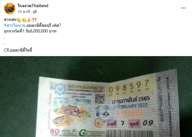 ก่อนอื่นต้องขอแสดงความดีใจกับผู้ที่ถูกรางวัลที่ 1 ด้วยนะคะ ซึ่งได้มีผู้ใช้เฟสบุ๊ครายหนึ่งได้โพสต์ภาพสาวโรงงานรายหนึ่ง พร้อมกับระบุข้อความว่า สาวโรงงาน อมตะซิตี้ชลบุรี เฟส7ถูกรางวัลที่1 รับ6,000,000 บาท