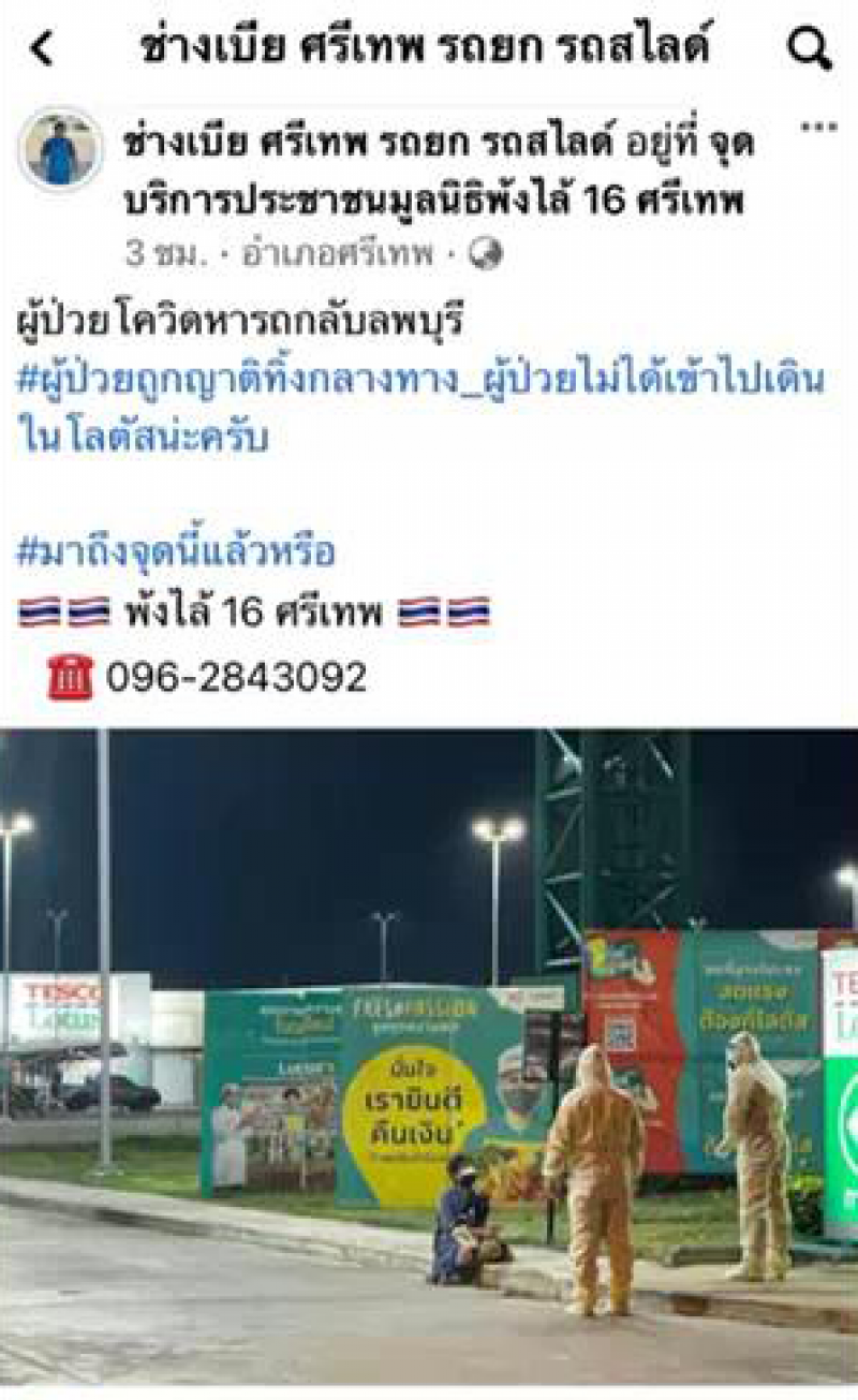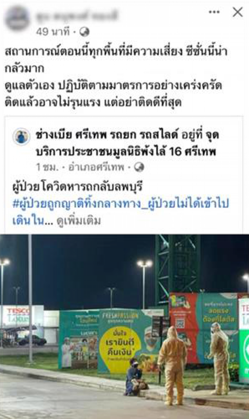 เมื่อวันที่ 17 กุมภาพันธ์ 2565 ที่ผ่านมา ได้มีรายงานว่า ผู้ใช้เฟซบุ๊กรายหนึ่งที่ใช้ชื่อว่า ช่างเบีย ศรีเทพ รถยก รถสไลด์ ได้โพสต์รูปภาพของผู้หญิง อายุ 54 ปี ซึ่งเป็นผู้ติด CV - 19 พร้อมระบุข้อความว่า หญิงรายนี้หารถกลับลพบุรี ถูกญาติทิ้งไว้ระหว่างทาง หญิงรายนี้ไม่ได้เข้าไปเดินในห้างโลตัสนะครับ มาถึงจุดนี้แล้วหรือ