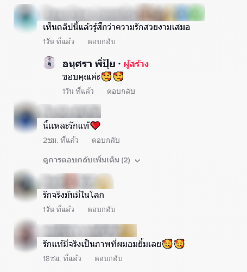 และหลังจากที่โพสต์คลิปออกไป ก็มีชาวโซเชียลเข้ามาแสดงความคิดเห็นกันเป็นจำนวนมาก เช่น เชื่อยังค่ะ ผู้หญิงที่รักจริงด้วยหัวใจก็มีค่ะ เธอไม่เคยแคร์ว่าผู้ชายจะเป็นยังไง #ทีมเจอรักแท้ค่ะ , คุณคือ1/1,000,000ของผู้หญิง , เห็นคลิปนี้แล้วรู้สึกว่าความรักสวยงามเสมอ