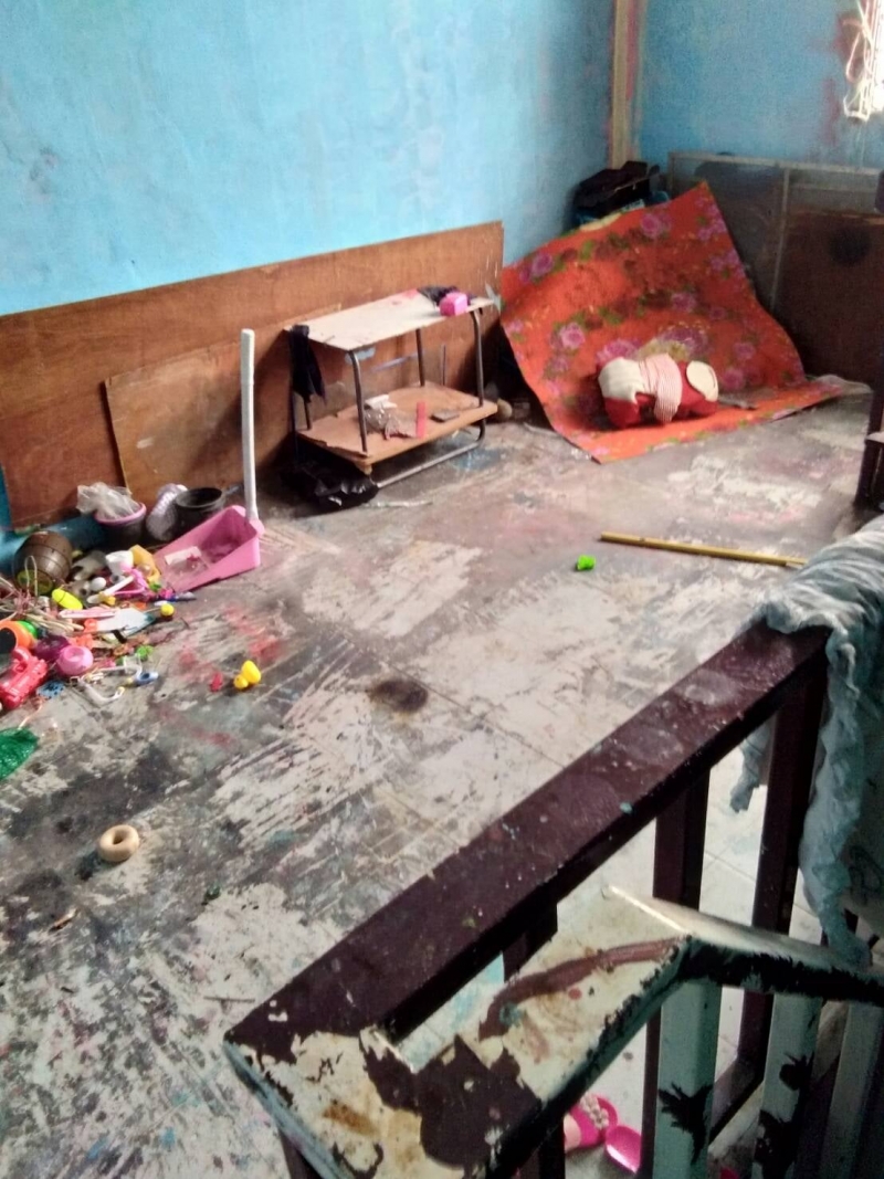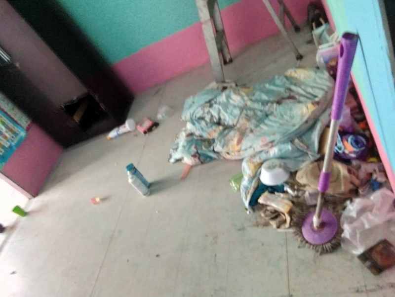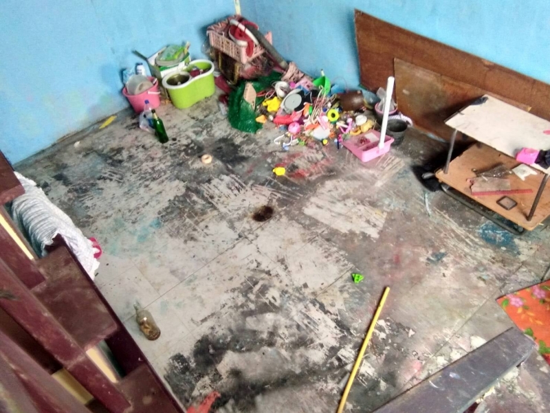 ส่วนสภาพภายในบ้านได้ทำการทุบทำลายผนัง+ประตู พ่น/สาดสี ตามพื้น ผนัง และบันได เทปูนทับพื้นกระเบื้องชั้น 1 ตัดสายเมนไฟ+หลอดไฟ หาย ก่อนจะหนีหายไป