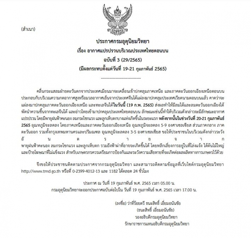 จึงขอให้ประชาชนติดตามประกาศจากกรมอุตุนิยมวิทยา และสามารถติดตามข้อมูลที่เว็บไซต์กรมอุตุนิยมวิทยา http://www.tmd.go.th หรือที่ 0-2399-4012-13 และ 1182 ได้ตลอด 24 ชั่วโมง ทั้งนี้ กรมอุตุนิยมวิทยาจะออกประกาศฉบับต่อไปใน วันที่ 19 กุมภาพันธ์ พ.ศ. 2565 เวลา 17.00 น.