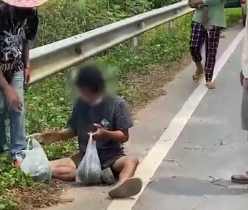 หนุ่มนอนอยู่ข้างทาง กอดแตงโมไว้แน่น