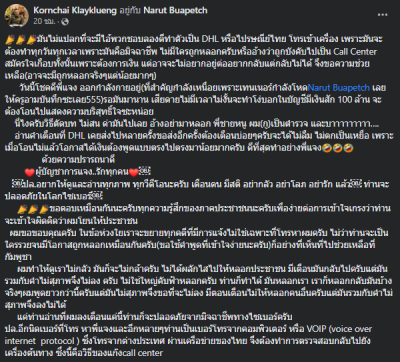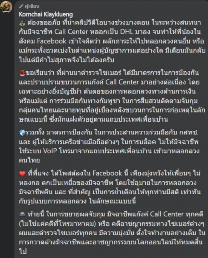 ทั้งนี้ที่ตนได้โพสต์ลงใน Facebook นี้ เพียงมุ่งหวังให้เพื่อน ๆ ไม่หลงกล และทำตามในสิ่งที่แก๊งคอลเซนเตอร์บอก โดยการเอาคืนแก๊งพวกนี้ และ ที่สำคัญเป็นการเตือนให้ทุกท่านมีสติ เท่าทันกับรูปแบบต่าง ๆ ของแก๊งคอลเซนเตอร์ ในลักษณะแบบนี้
