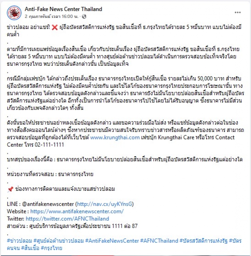 ล่าสุดธนาคารกรุงไทยได้ออกมาตรวจสอบข้อมูลดังกล่าวแล้ว โดยระบุว่าธนาคารยังไม่มีนโยบายปล่อยสินเชื่อสำหรับผู้ถือบัตรสวัสดิการแห่งรัฐแต่อย่างใด อีกทั้งเป็นการนำโลโก้ของธนาคารไปใช้โดยไม่ได้รับอนุญาต ซึ่งธนาคารไม่มีส่วนเกี่ยวข้องกับเพจดังกล่าวใดๆ ทั้งสิ้น