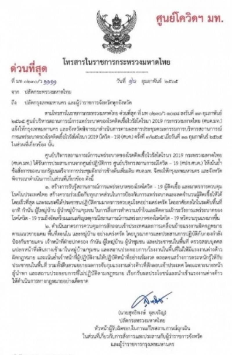 เมื่อวันที่ 20 ก.พ. นายสุทธิพงษ์ จุลเจริญ ปลัดกระทรวงมหาดไทย (มท.) ได้สั่งการโทรสารในราชการกระทรวงมหาดไทยด่วนที่สุดให้ผู้ว่าราชการจังหวัด และผู้ว่าราชการจังหวัดกรุงเทพมหานคร ป้องกันและควบคุม CV-19 อย่างเคร่งครัด พร้อมทั้งเฝ้าระวังตามแนวชายแดน