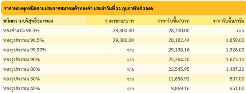 สำหรับทองรูปพรรณ 96.5% รับซื้ออยู่ที่บาทละ 28,182.44 บาท และมีราคาขายออกที่ 29,300 บาท ขณะที่ราคาทองคำตลาดโลก (Gold Spot) อยู่ที่ 1,893.50 เหรียญสหรัฐต่อออนซ์ สรุปราคาทองคำ วันที่ 21 ก.พ. 2565