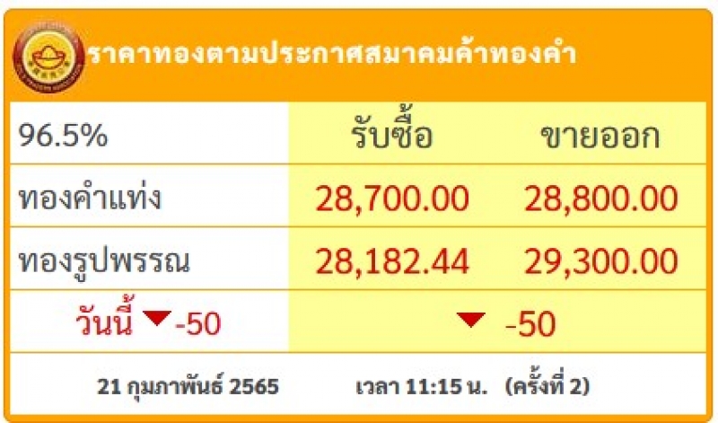 ผู้สื่อข่าวรายงานว่า ราคาทองคำวันนี้ (21 ก.พ. 2565) ปรับราคาลง 50 บาท เมื่อเปรียบเทียบกับราคาปิดวานนี้ โดยราคาขายออกทองรูปพรรณ อยู่ที่ 29,300 บาท ตามข้อมูลจากเว็บไซต์ของสมาคมค้าทองคำ หรือ Gold Traders Association เมื่อ 11.15 น.ที่ผ่านมา