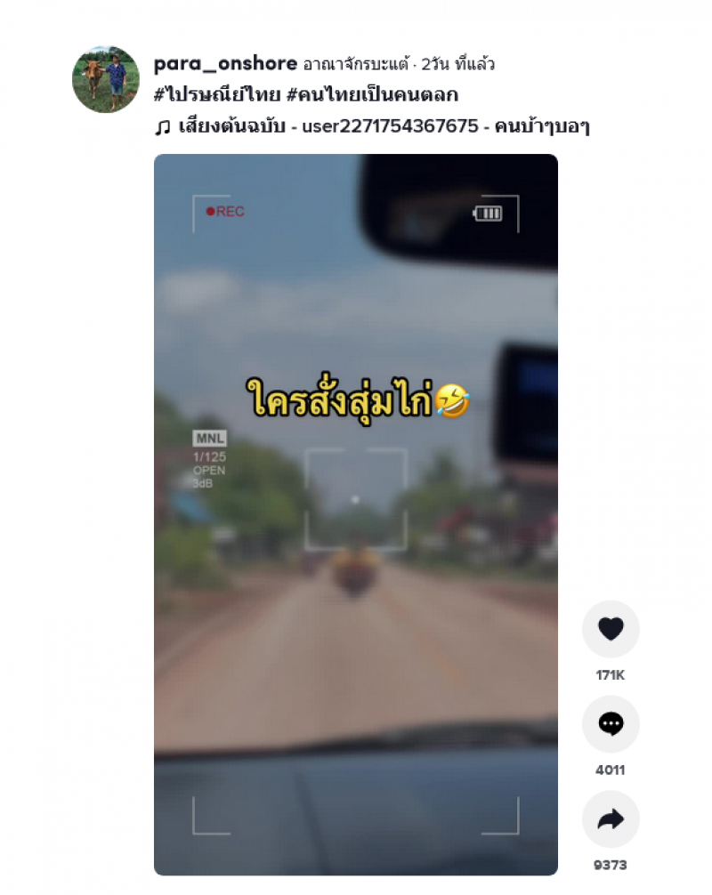 กลายเป็นอีกหนึ่งคลิปขำขันในโลกออนไลน์ หลังจากที่ผู้ใช้ tiktok ชื่อ para_onshore ได้โพสต์คลิปบุรุษไปรษณีย์ท่านหนึ่ง ที่กำลังขี่รถมอเตอร์ไซค์ส่งพัสดุตามบ้าน แต่มีสิ่งที่สะดุดตาคือ มีสุ่มไก่ลูกใหญ่ จำนวน 3 ลูกมัดติดท้ายมาด้วย เรียกได้ว่า ไปรษณีย์ไทยส่งได้ทุกอย่างจริงๆ