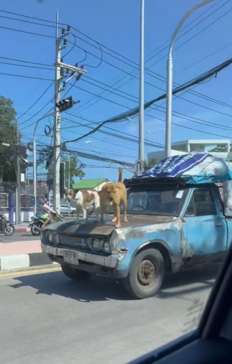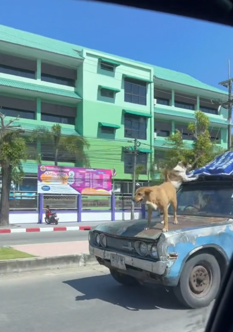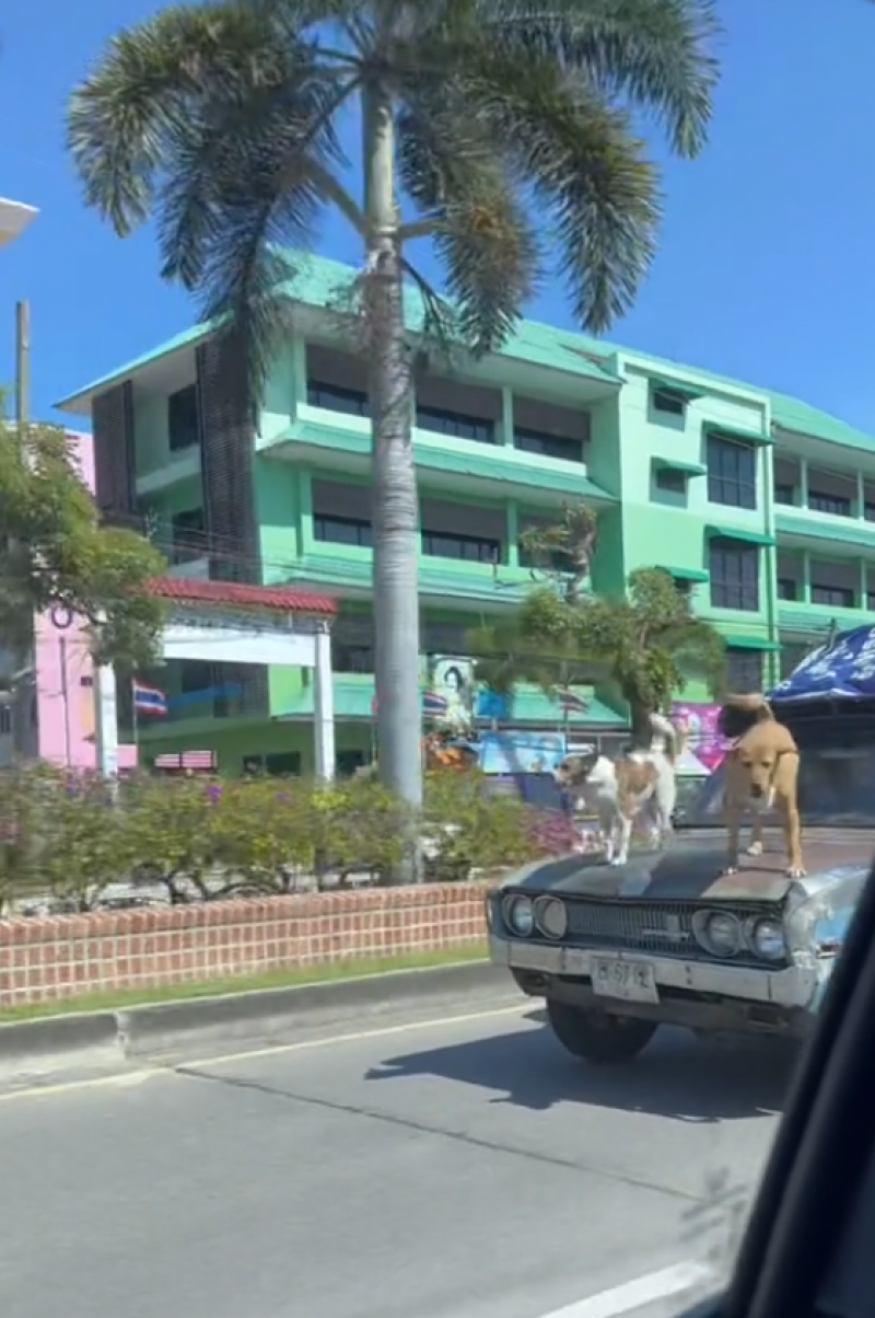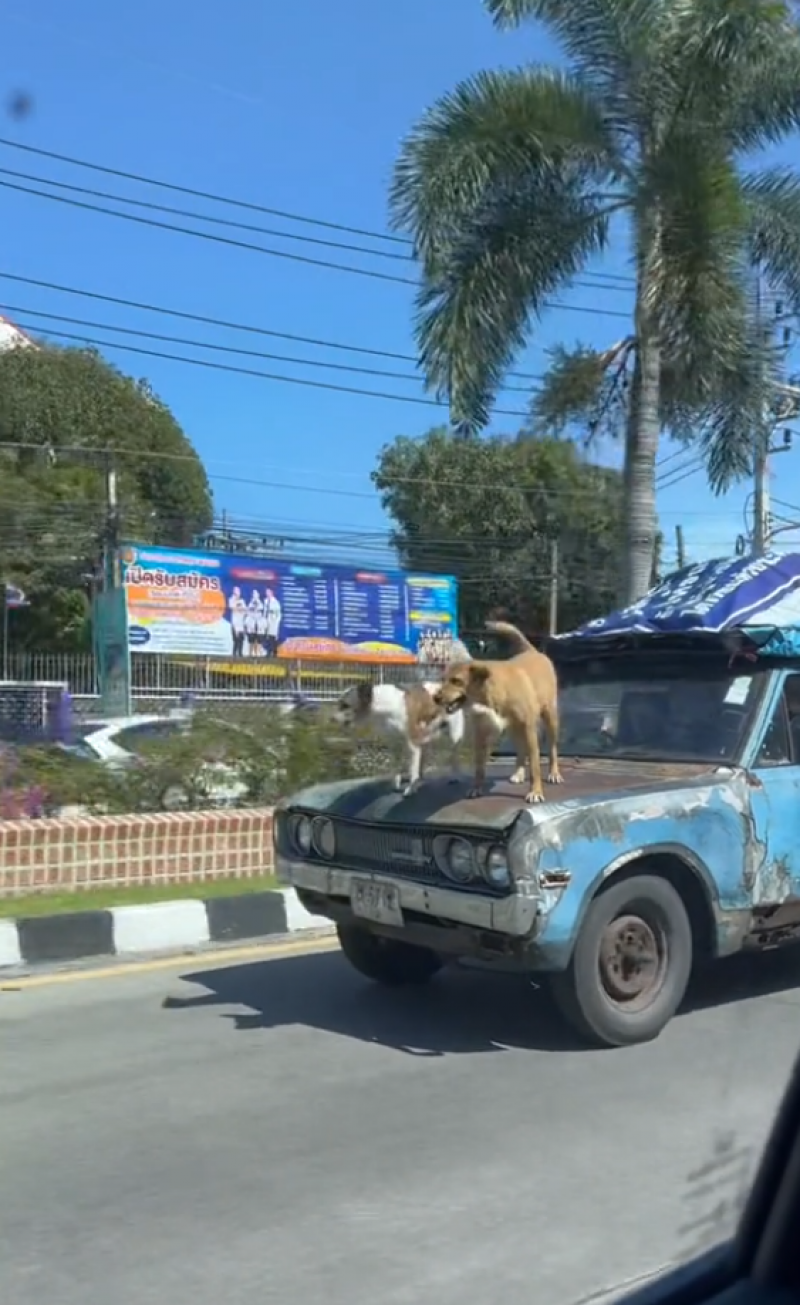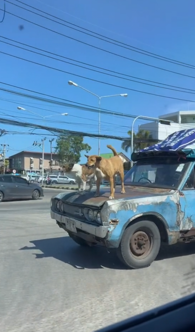 โดยคลิปดังกล่าวเผยให้เห็นเจ้าสุนัขสองตัว ยืนโพสต์ท่าสุดเท่ บนหน้ากระโปรงรถยนต์ที่กำลังวิ่งอยู่บนถนนด้วยความเร็ว ซึ่งเจ้าสุนัขทั้งสองตัวนี้ไม่ได้มีท่าทีตื่นเต้นกับการทำแบบนี้เลย สงสัยว่าน่าจะทำแบบนี้มาหลายครั้งแล้ว