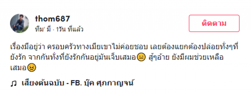 เรียกได้ว่าเป็นคลิปที่น่าสนใจอีกคลิปหนึ่ง หลังจากที่มีผู้ใช้ TikTok @thom687 ได้ทำการโพสต์คลิปของชายรายหนึ่ง พร้อมแคปชั่นว่า เรื่องมีอยู่ว่า ครอบครัวทางเมียเขาไม่ค่อยชอบ เลยต้องแยกต้องปล่อยทั่ง ๆ ที่ยังรัก จากกันทั้งที่ยังรักกันอยู่ มันทำใจยากเสมอ เป็นกำลังใจให้ ยังมีผมช่วยเหลือเสมอ