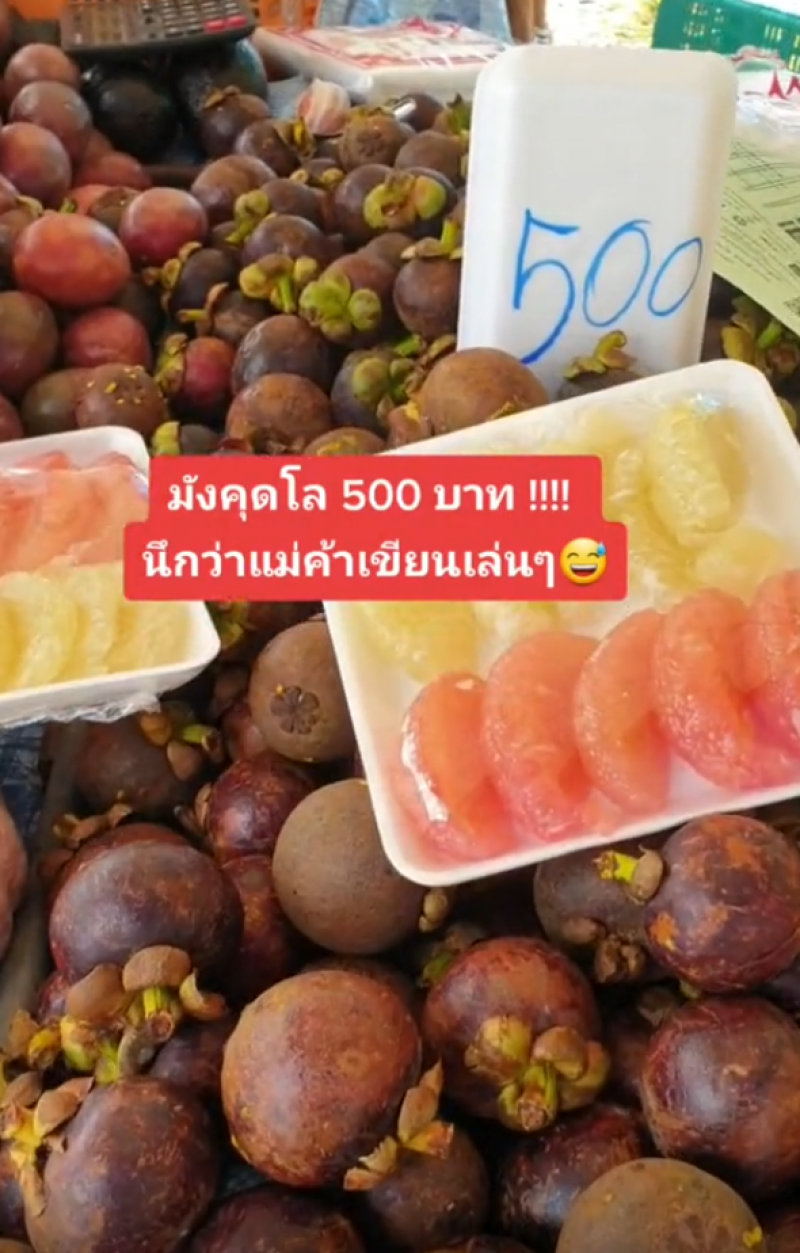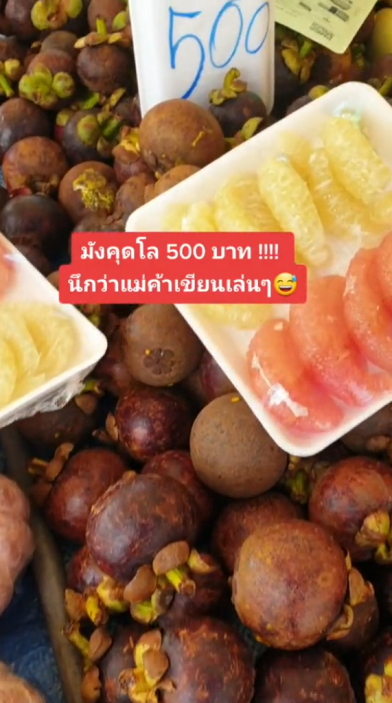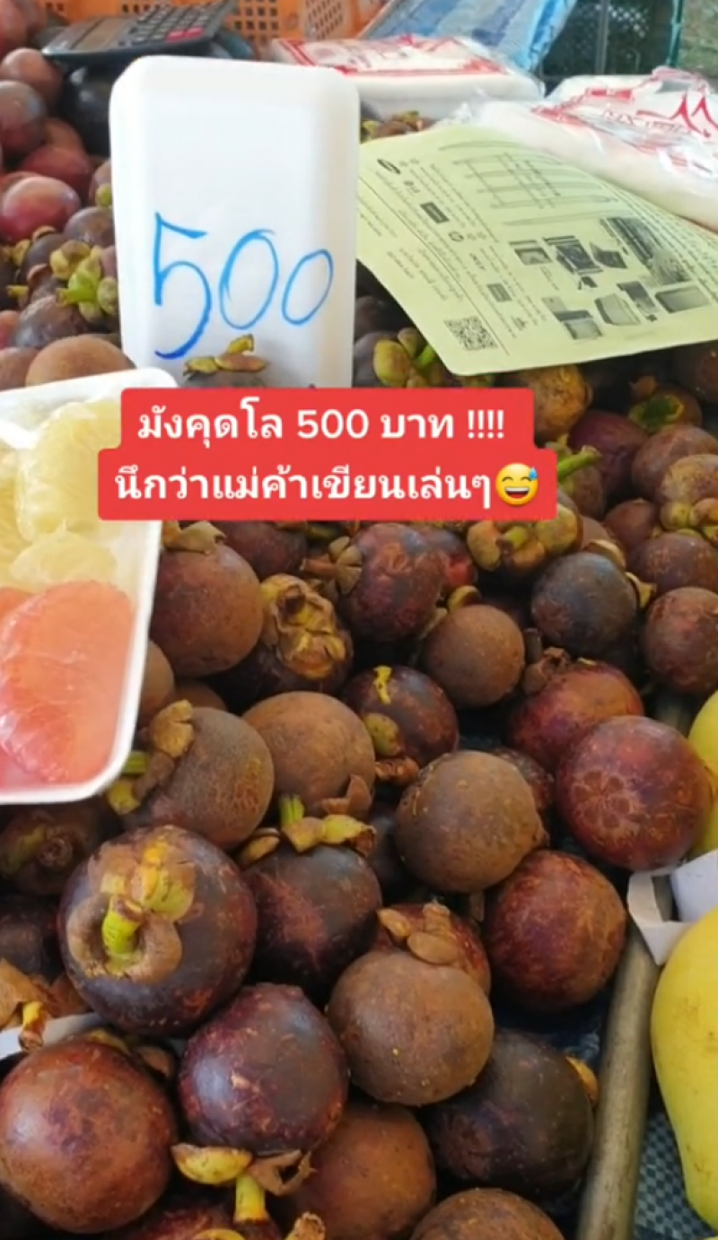 โดยเธอนั้นถึกกับพูดไม่ออก เมื่อเจอกับมังคุดนอกฤดูกาล ราคากิโลกรัมละ 500 บาท ทีแรกก็นึกว่าแม่ค้าเขียนเล่นขำ ๆ จึงลองถามดู แม่จึงบอกว่ารับมาโลละ 300 กว่าบาทแล้ว ซึ่งเจ้าของคลิปถึงกับไม่รู้จะทำยังไง ได้แต่ตอบไปว่า ก็อยากกินนะ แต่เจอราคาแบบนี้ ทนซื้อไม่ได้จริง ๆ