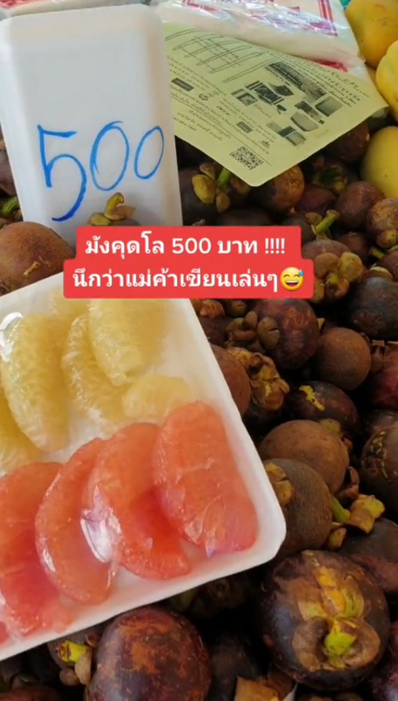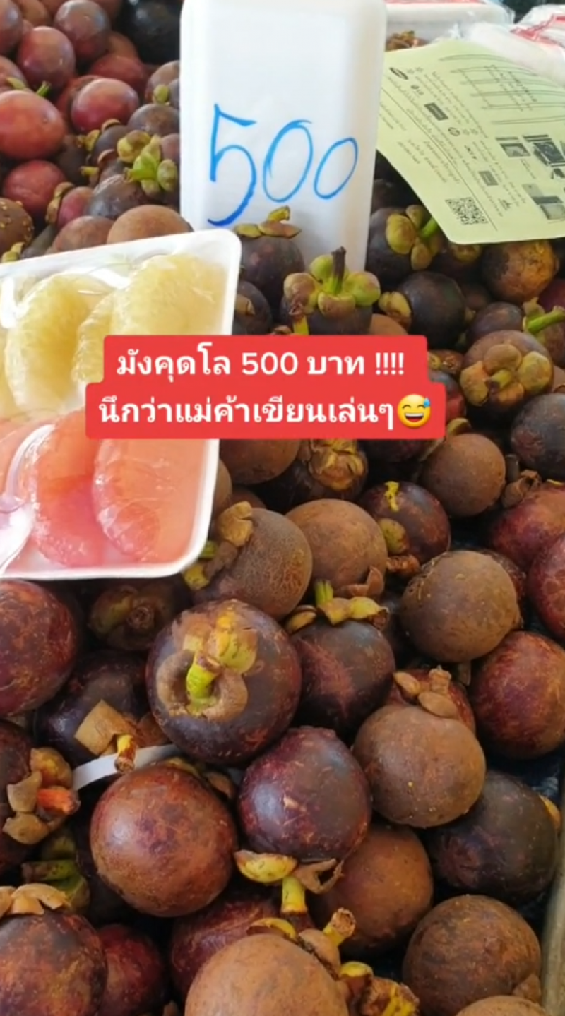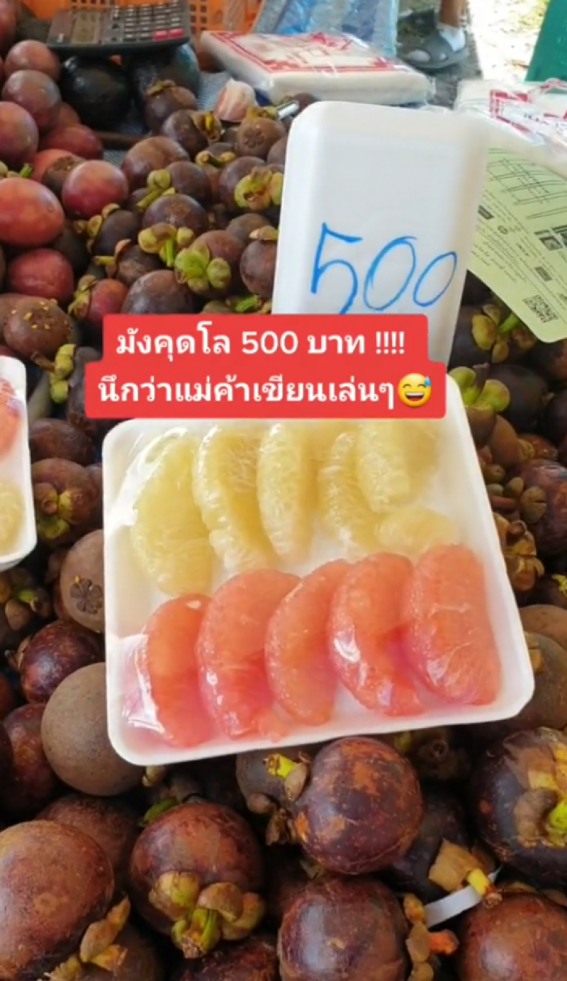 โดยเธอนั้นถึกกับพูดไม่ออก เมื่อเจอกับมังคุดนอกฤดูกาล ราคากิโลกรัมละ 500 บาท ทีแรกก็นึกว่าแม่ค้าเขียนเล่นขำ ๆ จึงลองถามดู แม่จึงบอกว่ารับมาโลละ 300 กว่าบาทแล้ว ซึ่งเจ้าของคลิปถึงกับไม่รู้จะทำยังไง ได้แต่ตอบไปว่า ก็อยากกินนะ แต่เจอราคาแบบนี้ ทนซื้อไม่ได้จริง ๆ