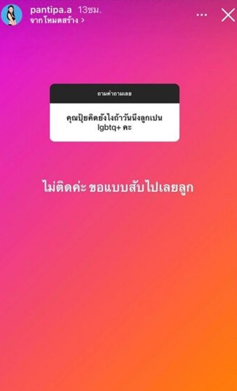 ในขณะที่มีแฟนคลับอีกคนหนึ่งถามว่า คุณปุ้ยคิดยังไง ถ้าวันหนึ่งลูกเป็น LGBTQ+ค่ะ โดย ปุ้มปุ้ย เปิดใจว่า ไม่ติดค่ะ ขอแบบซับไปเลยลูก