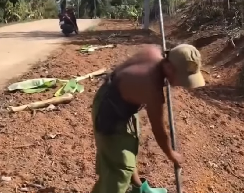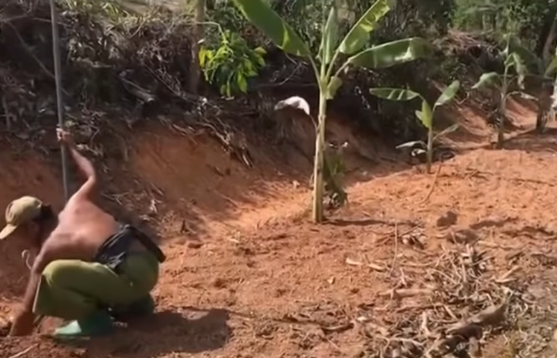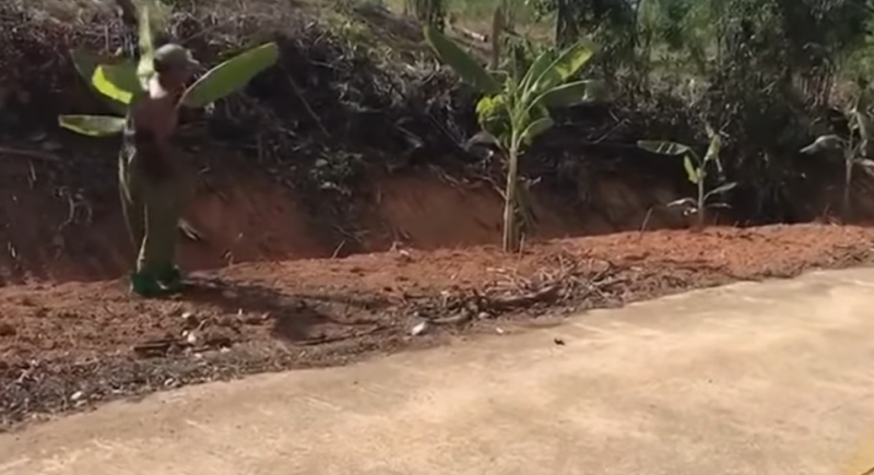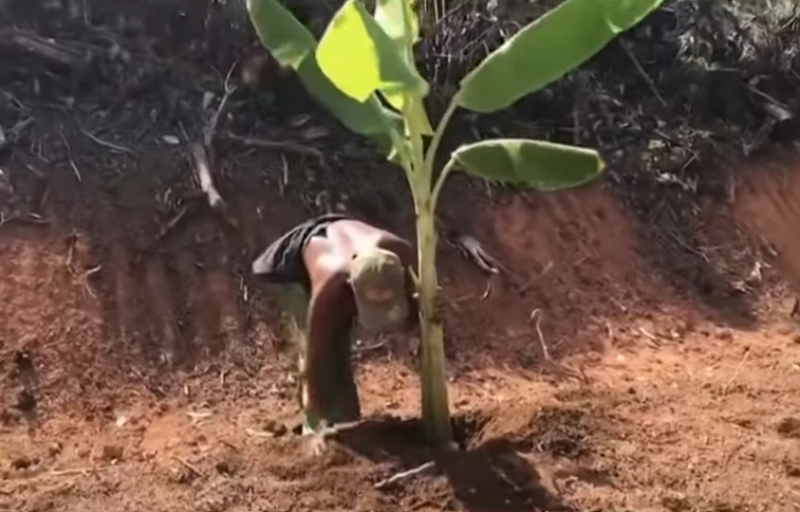 โดยขุดหลุมริมถนน ห่างจากขอบถนนประมาณ 1 เมตรเศษ และนำหน่อกล้วยมาปลูกใหม่ ทำให้ผู้ที่ขับรถผ่านไปมาแปลกใจไปตามกัน เนื่องจากที่ดินที่ใช้ปลูกกล้วย เป็นที่ดินในเขตทางหลวง และนำกล้วยมาปลูกได้อย่างไร