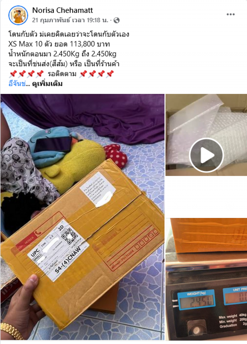 ข้อความจากโพสต์ดังกล่าวระบุไว้แบบนี้ โดนกับตัว ม่เคยคิดเลยว่าจะโดนกับตัวเอง XS Max 10 ตัว ยอด 113,800 บาท น้ำหนักตอนมา 2.450Kg ถึง 2.450kg จะเป็นที่ข่นส่ง(สีส้ม) หรือ เป็นที่ร้านค้า