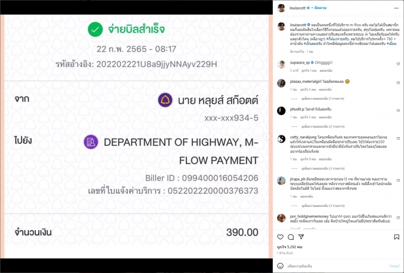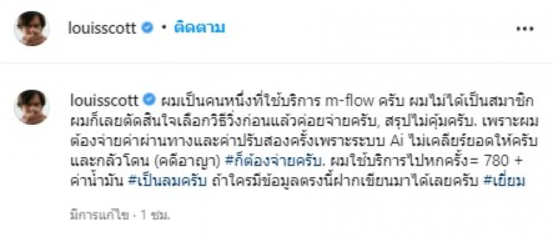 ล่าสุด หลุยส์ สก๊อต ได้ใช้บริการ m-flow โดยได้โพสต์ข้อความผ่านอินสตาร์แกรมพร้อมระบุข้อความว่า ผมเป็นคนหนึ่งที่ใช้บริการ m-flow ครับ ผมไม่ได้เป็นสมาชิกผมก็เลยตัดสินใจเลือกวิธีวิ่งก่อนแล้วค่อยจ่ายครับ, สรุปไม่คุ้มครับ. เพราะผมต้องจ่ายค่าผ่านทางและค่าปรับสองครั้งเพราะระบบ Ai ไม่เคลียร์ยอดให้ครับ และกลัวโดน (คดีอาญา) ก็ต้องจ่ายครับ. ผมใช้บริการไปหกครั้ง= 780 + ค่าน้ำมัน เป็นลมครับ ถ้าใครมีข้อมูลตรงนี้ฝากเขียนมาได้เลยครับ เยี่ยม