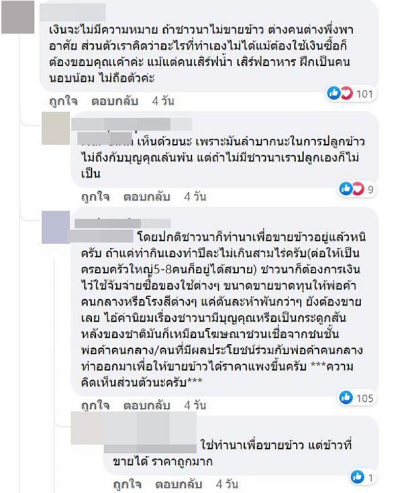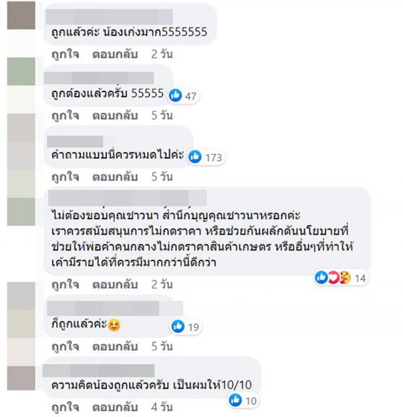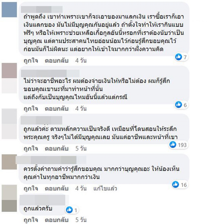 งานนี้ก็มีคนเข้ามาคอมเมนต์กันสนั่น ทั้งเห็นด้วยกับความคิดของหนูน้อย บอกว่าถูกแล้ว คำถามแบบนี้ควรหมดไปได้แล้ว น้องเก่งมาก คิดตามหลักความเป็นจริง เขาก็เอาของมาและเงิน เราก็เอาเงินแลกของ มันไม่มีบุญคุณกันอยู่แล้ว แต่อีกด้านก็มองว่าไม่ว่าจะอาชีพอะไร เราต้องจ่ายเงินให้ไหม ก็รู้สึกขอบคุณเขาที่ทำหน้าที่นั้น แต่จะถึงกับเป็นบุญคุณไหม แล้วแต่กรณี และมีที่มองว่าเงินจะไม่มีความหมาย ถ้าชาวนาไม่ขายข้าว ต่างคนต่างก็พึ่งพาอาศัยกัน อะไรที่เราทำเองไม่ได้ แม้ต้องใช้เงินซื้อก็ต้องขอบคุณเขา ฝึกเป็นคนนอบน้อม ไม่ถือตัว