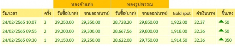 ราคาทองประจำวันพฤหัสบดีที่ 24 กุมภาพันธ์ 2565 ประกาศครั้งที่ 1 (เปิดตลาด) เมื่อเวลา 09.30 น. ปรับขึ้นพรวด 350 บาท ทำจุดสูงสุดใหม่ในรอบ 19 เดือน เมื่อเทียบกับประกาศราคาซื้อขายครั้งสุดท้ายของวันพุธ ที่ตลอดทั้งวันมีการประกาศราคาทองทั้งหมด 6 รอบ รวมราคาปรับลงแรง 250 บาท