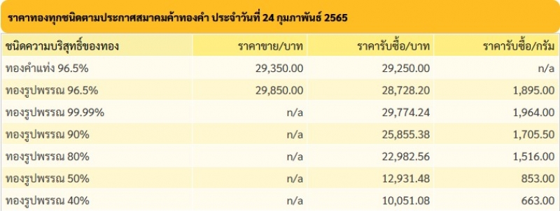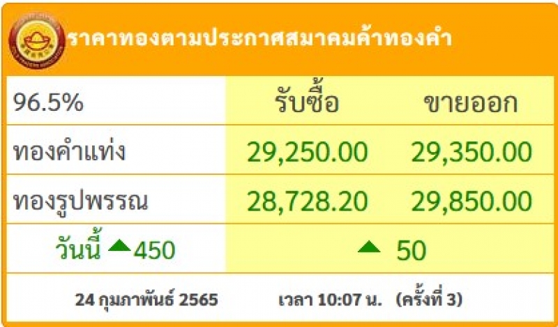 ราคาซื้อขายทองคำในประเทศชนิด 96.5% วันพฤหัสบดีที่ 24 กุมภาพันธ์ 2565 (ประกาศครั้งที่ 1)