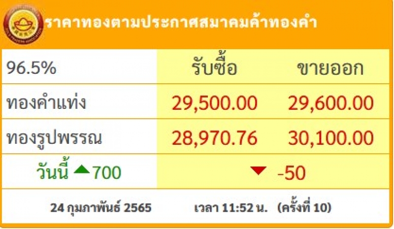 ราคาซื้อขายทองคำในประเทศชนิด 96.5% วันพฤหัสบดีที่ 24 กุมภาพันธ์ 2565 (ประกาศครั้งที่ 10 เวลา 11:52 น.)