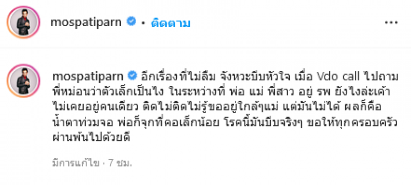 ล่าสุด มอสก็ได้โพส์คลิปวินาทีสุดบีบหัวใจผ่านทางอินสตาแกรมส่วนตัว mospatiparn ในช่วงที่รักษาตัวและลูกสาว ปล่อยโฮด้วยความคิดถึง เพราะต้องแยกห่างกัน