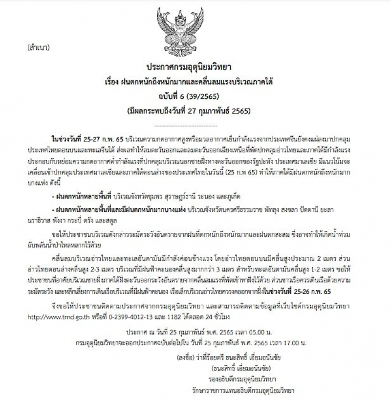 วันที่ 25 ก.พ.2565 กรมอุตุฯ ประกาศ ฝนตกหนักถึงหนักมากและคลื่นลมแรงบริเวณภาคใต้ (มีผลกระทบถึงวันที่ 27 กุมภาพันธ์ 2565) ฉบับที่ 6 ระบุว่า ในช่วงวันที่ 25-27 ก.พ.65 บริเวณความกดอากาศสูงหรือมวลอากาศเย็นกำลังแรงจากประเทศจีนยังคงแผ่ลงมาปกคลุมประเทศไทยตอนบนและทะเลจีนใต้ ส่งผลทำให้ลมตะวันออกและลมตะวันออกเฉียงเหนือที่พัดปกคลุมอ่าวไทยและภาคใต้มีกำลังแรง